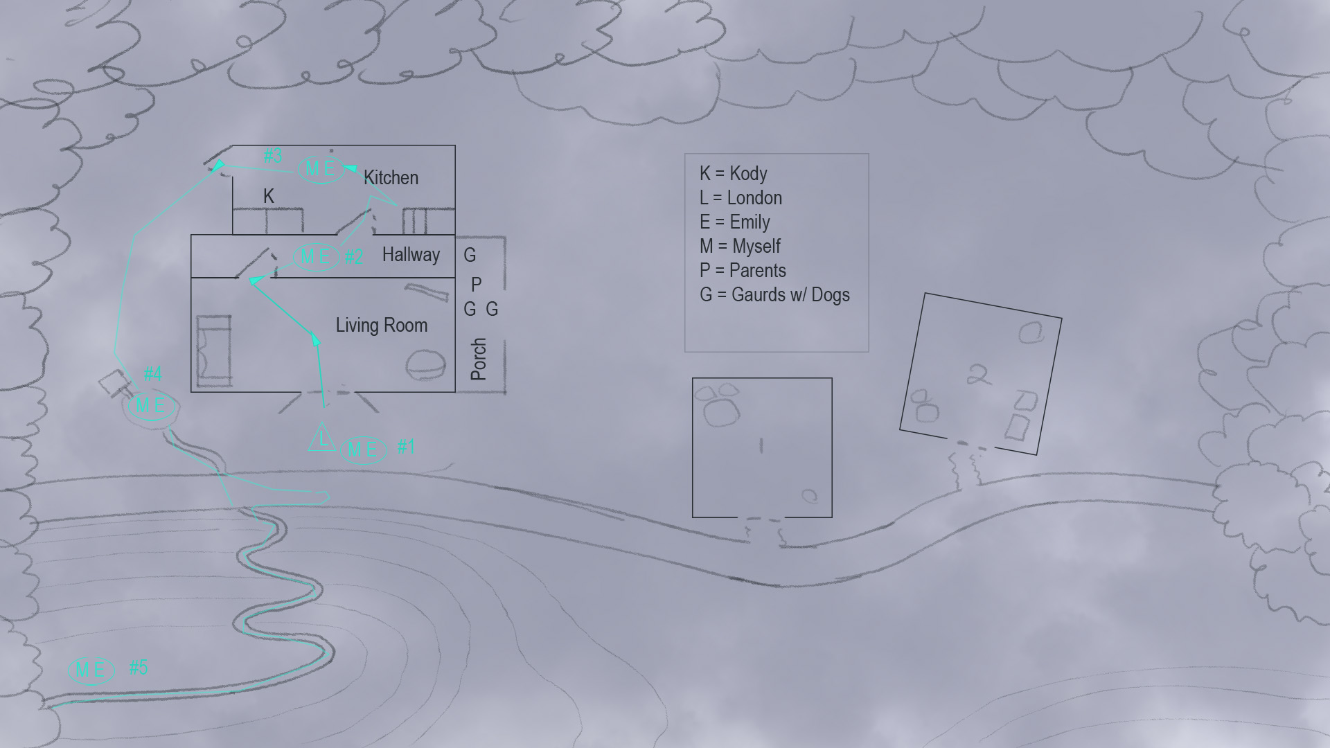 We run around the side to the front. My sister wants to get some of our things Kody and London have locked in another cabin. I persist and drag my sister down a trail leading up a hill into the forest. London is staring at us, arms crossed as we run up the hill to escape.